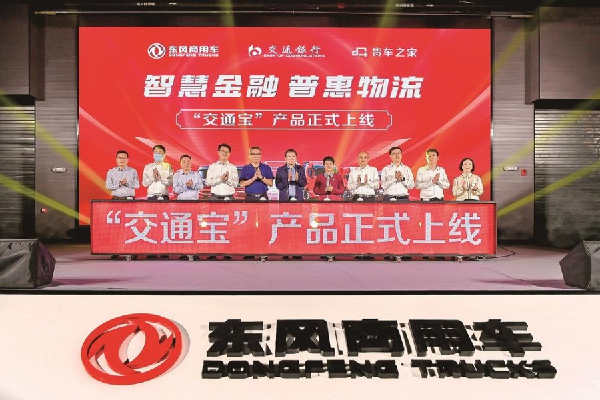 5月31日,由东风商用车有限公司、交通银行湖北省分行、货车之家(南京)科技有限公司联合为国内3000万卡车司机量身打造的第一款“智慧金融 普惠物流”——“交通宝”全线上ETC贷款产品,在东风商用车品牌体验中心上线发布。