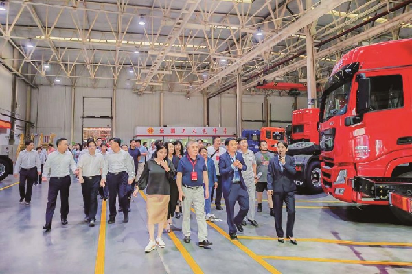 走进东风商用车有限公司车辆工厂,整洁的现场、有序的组织、顺畅的物流,这是一条现代化的全系列车型装配线,正致力于打造“国际化商用车制造标杆工厂”。从安装前桥的第一个步骤,到最后整车驶出装配线,外宾们兴致勃勃地参观了商用车装配的全部流程,智能化的管理、自动化的流程、信息化的先进技术,让外宾们赞叹不已。