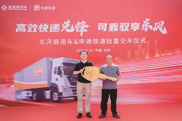 7月26日,“高效快递先锋,可靠驭享东风”东风商用车与申通快递批量交车仪式在杭州举行,100辆为申通快递量身定制的东风天龙KL 4×2牵引车交付客户。