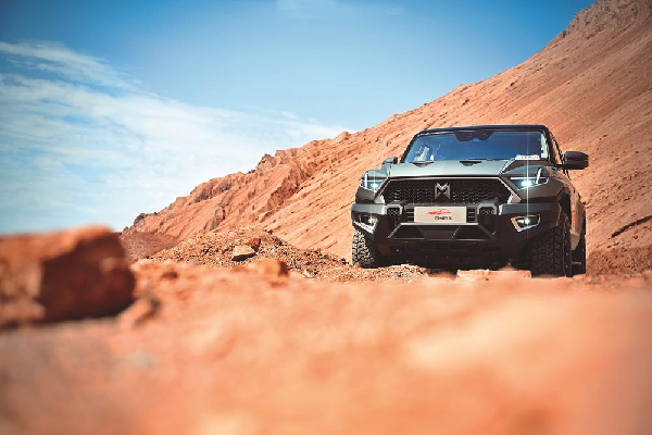 东风豪华电动越野车猛士917在吐鲁番接受由央视记者、汽车测评专家组成的专业测评团队的实地测试