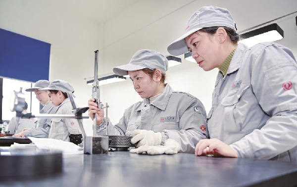 东风汽车零部件(集团)有限公司刃量具分公司齿轮车间检查班是一个女职工占多数的班组。该班组坚决贯彻质量管理“三不”(不接受不合格品、不制造不合格品、不流出不合格品)原则,大幅降低不良品流出;坚持提升服务质量,通过每班一小时的延班,产品首检等待时间大大缩短。图为班组女职工认真检查产品质量。