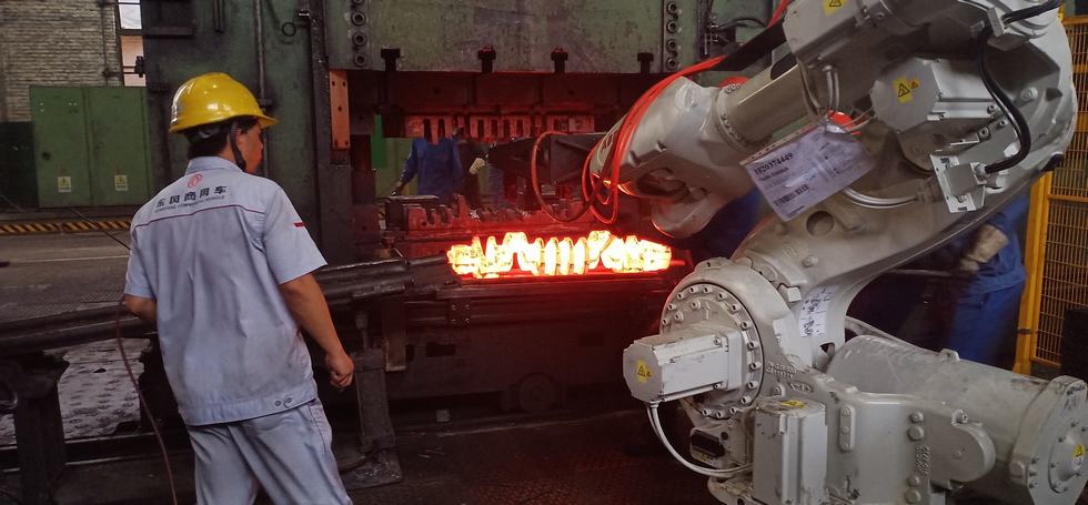 8月23日凌晨,随着东风锻造公司锻造厂120MN锻造生产线圆满完成164件新康C曲轴生产任务,“万吨线”自动化改造项目顺利投产,“万吨线”进入自动化时代。据了解,120MN锻造生产线,俗称“万吨线”,于1976年从西德引进,当时价值约半吨黄金。此次改造提升了整线自动化水平,降低了员工劳动强度。图为改造后的“万吨线”在进行自动化生产。