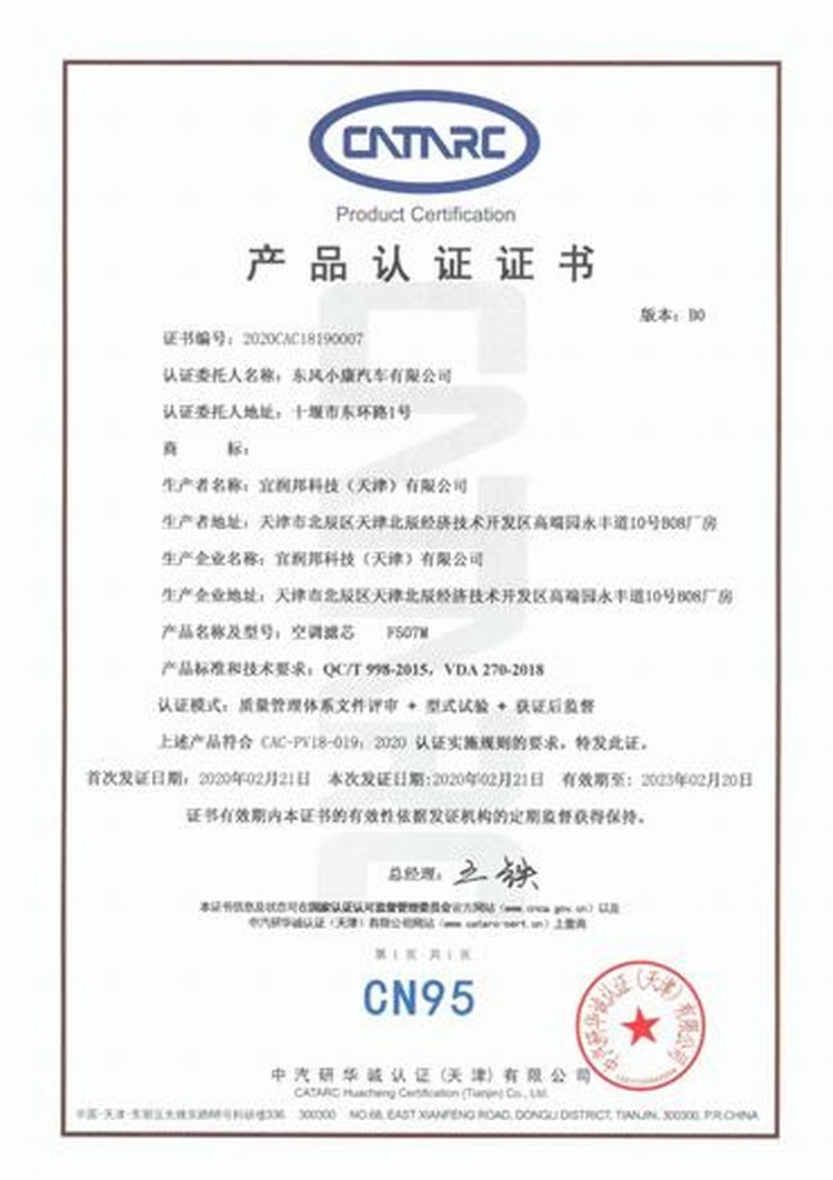 CN95认证项目,旨在进一步规范汽车空调滤清器市场,促进我国汽车产品在健康防护领域更快发展。