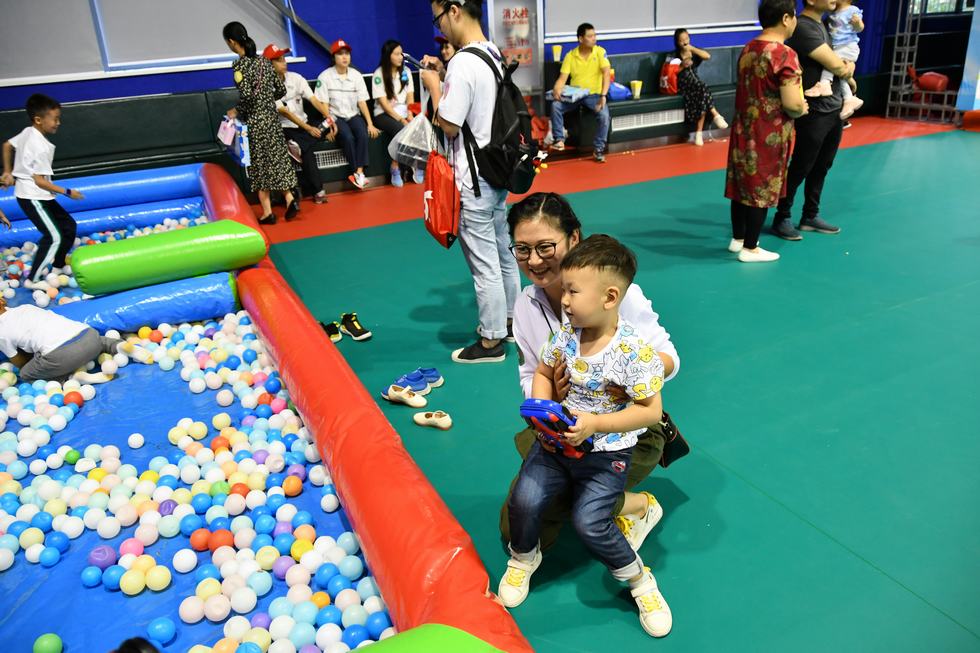 “亲子投篮”中,家长和孩子两人头戴迷你篮板,尝试把迷你篮球送入彼此篮筐中。该项目考察亲子默契能力,为找准角度投篮,家长、孩子忽近忽远,“好球”的赞叹声不断响起。