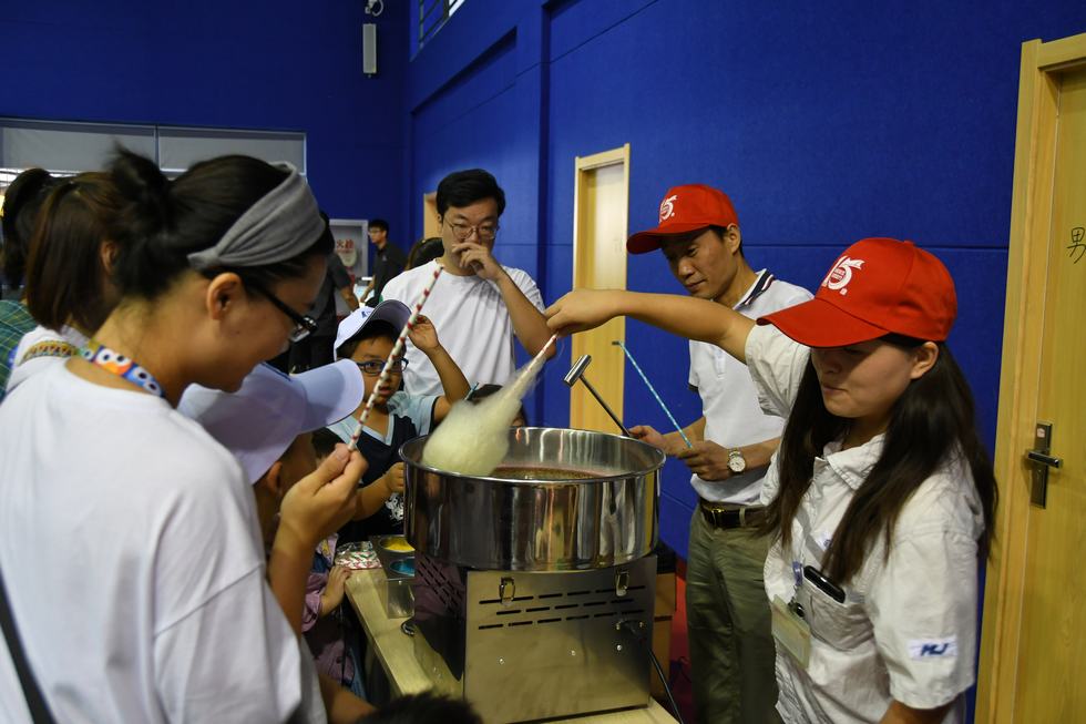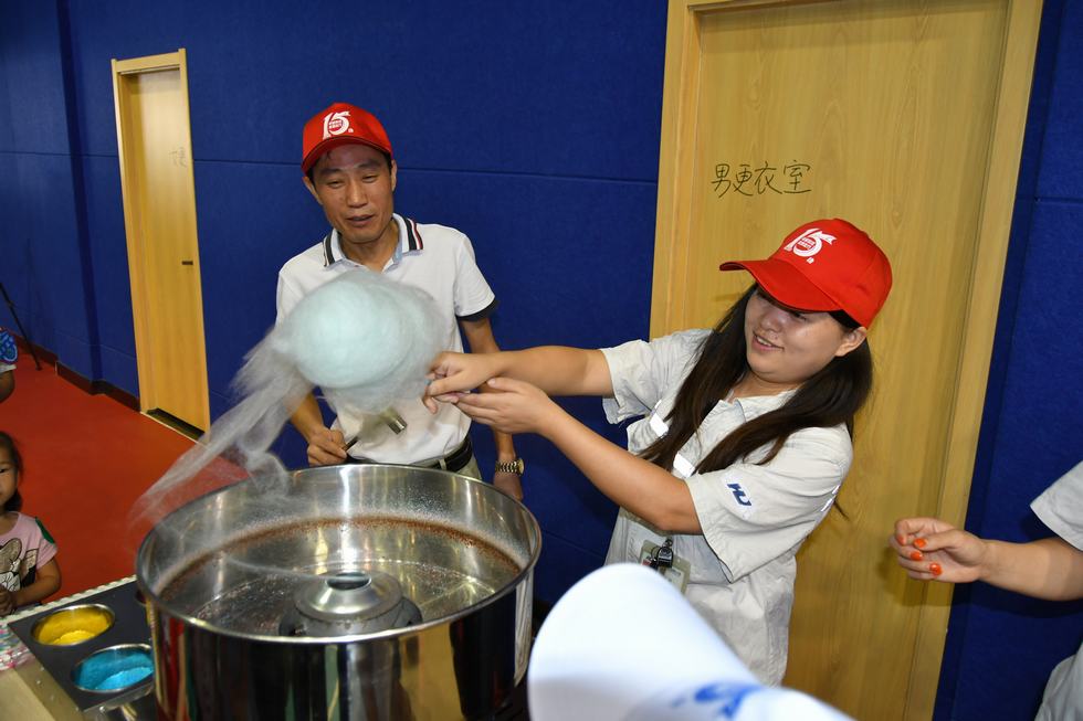 “我要一份大份的爆米花!”“帮我做一只蝴蝶!”在休闲特色区,孩子们在制作棉花糖和糖人的摊位前排起了长队。