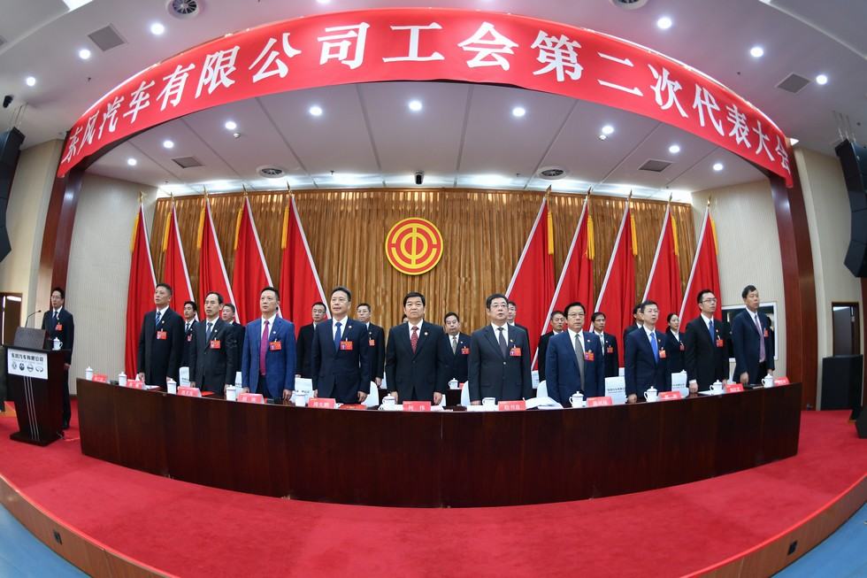 主会场内,气氛隆重热烈,主席台上方悬挂着“东风汽车有限公司工会第二次代表大会”会标,幕布正中是象征中国工会和中国工人阶级团结统一的中国工会会徽,十面鲜艳的红旗分列两侧。报告厅后方悬挂着“汇聚先行磅礴力 携手共筑同心圆 团结动员全体员工为实现公司高质量发展建功立业”的横幅。